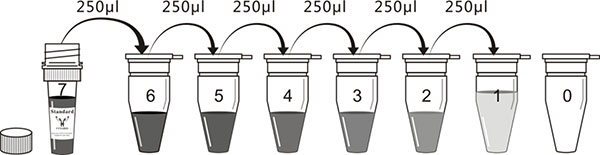 ② 取7個1.5mL 離心管(S0-S6)依次排列,各加入250µL樣本稀釋液。吸取250µL 標準品S7到第一個離心管中(S6),輕輕吹打混勻。從S6中吸取250µL到第二個EP管中(S5),輕輕吹打混勻。以此類推進行標準品的倍比稀釋。S0為樣本稀釋液。