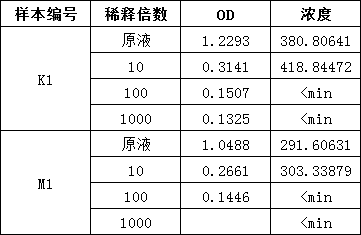 待測樣本為腦組織K1、M1(為隨機(jī)編號),選擇不同的稀釋倍數(shù)做預(yù)實(shí)驗(yàn),其相應(yīng)的OD如下: